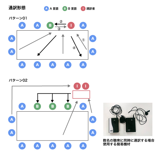 同時通訳と同じように発言者の話とほぼ同時に訳していく方法です。通訳者は聞き手の近くに位置し、ささやく程度の声で通訳を行います。簡易機材を使い、数名の聴衆に同時に通訳する場合もあります。